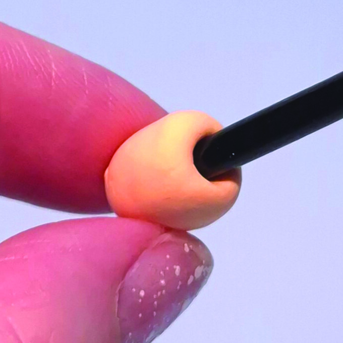 Make a shallow hole in one end - we've used the rounded end of a paintbrush, but you could use the pointed tip of a pen lid. Press a little at a time to avoid the clay sticking to the tool.