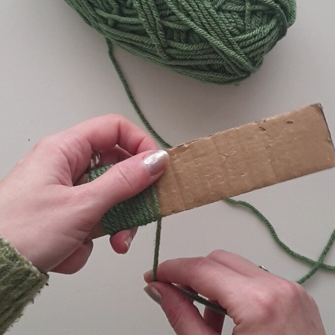 With your card, cut a template to help you cut the yarn. Cut a strip of card approx. 3.5cm wide.