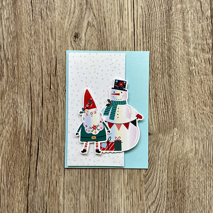 Step 2: Make the stickers into toppers by sticking them to cardstock first then fussy cut them out creating a sturdier topper. Fix the snowman to the card front using 3D foam pads.