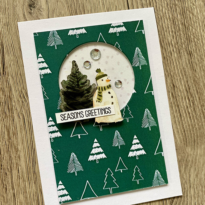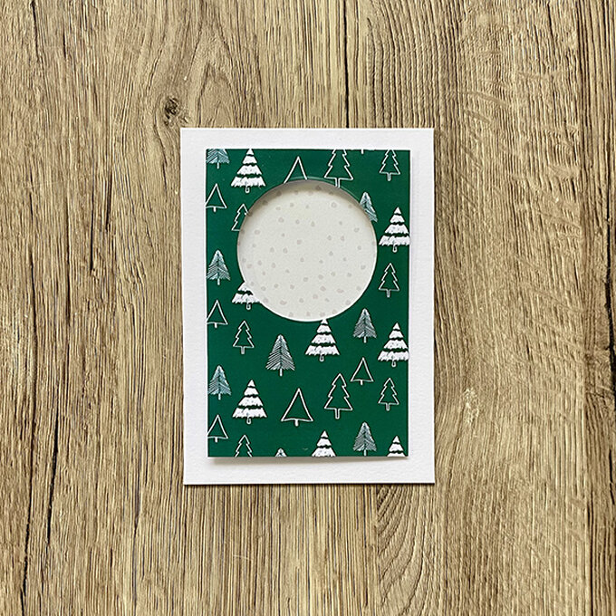 Step 2: Glue a piece of patterned paper to some cardstock to give it stability. Trim the panel to measure 12.7x8.4cm then cut a circle shape into the top half (this can be done using a die cutting machine, scissors or a craft knife) attach to the card front using 3D foam pads.