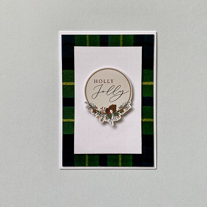 Step 3: Stick the holly jolly sticker to a piece of cardstock then fussy cut out to create a firmer topper, attach to the card front with 3D foam pads.