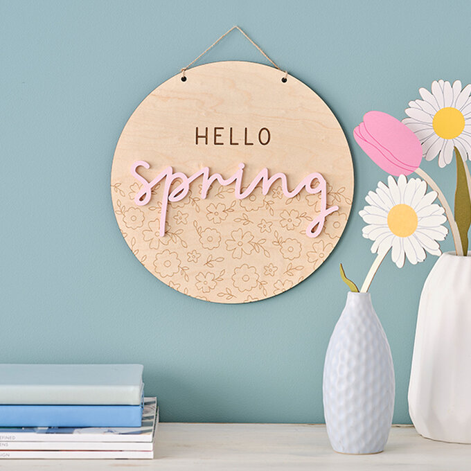 Place the maple plywood in your Glowforge and open the Glowforge homepage on your device. Click on 'Create a New Design’ on the left of the screen, then click on 'Upload a File’ and select the Spring Sign file.