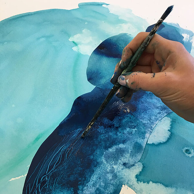 We're experimenting with a wide range of media and working in layers here. Start off by watering down the main colours in your painting with a drop of flow extender (this helps the paint pigment stretch further on the surface).