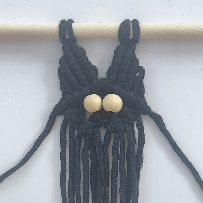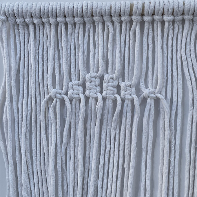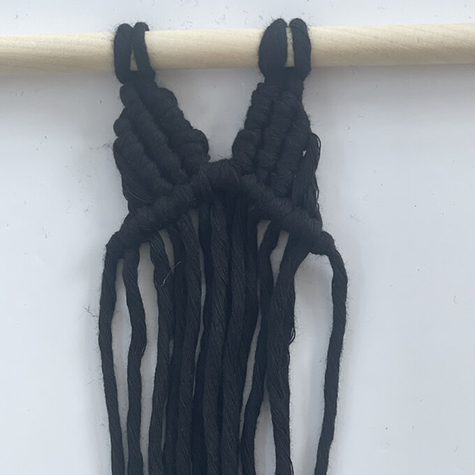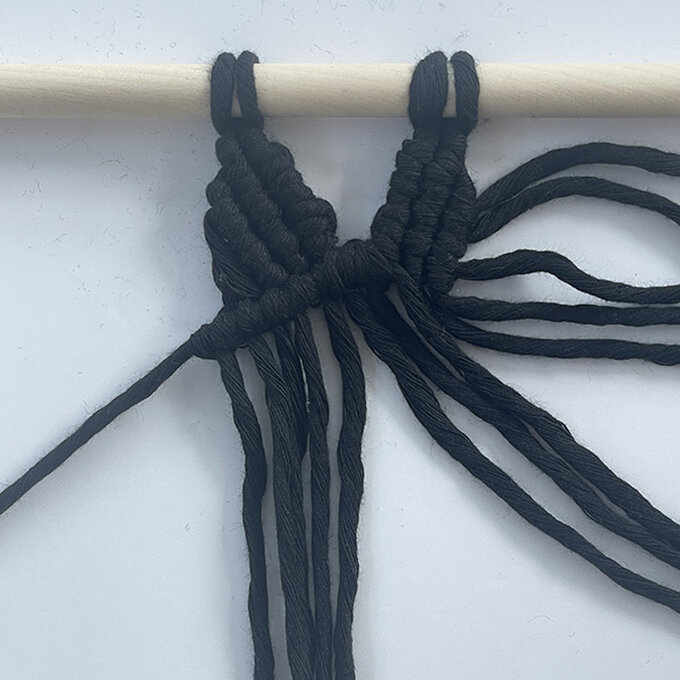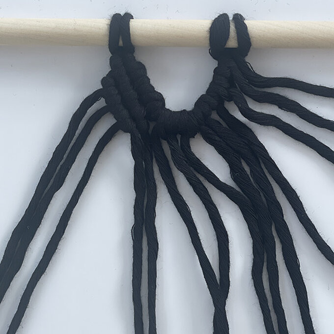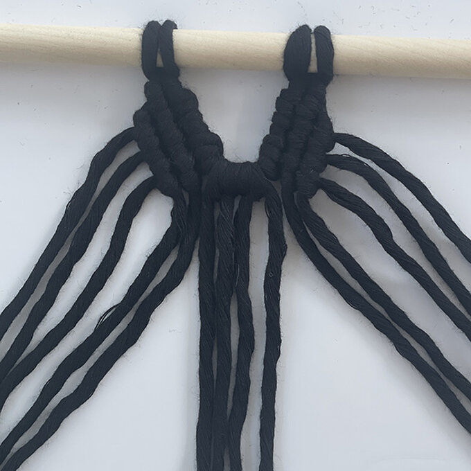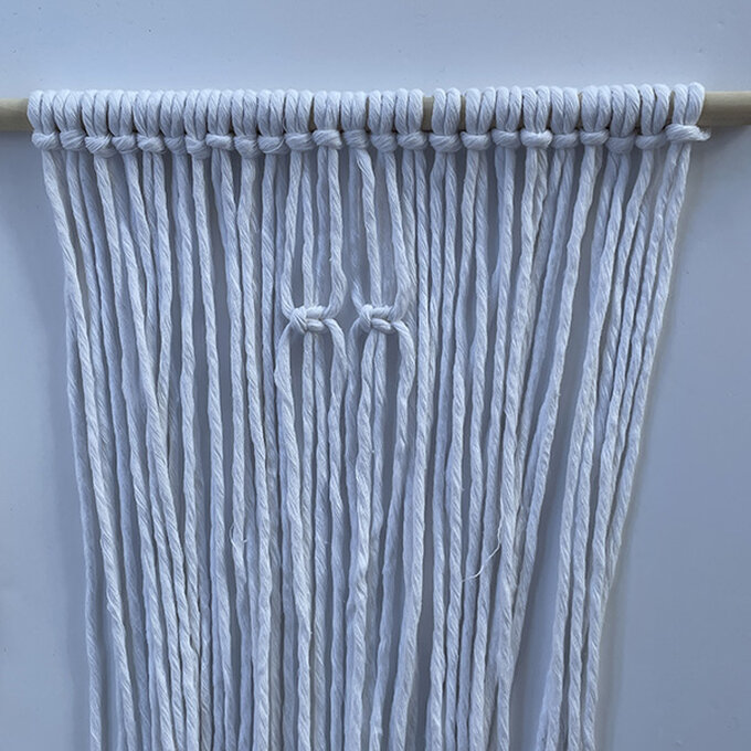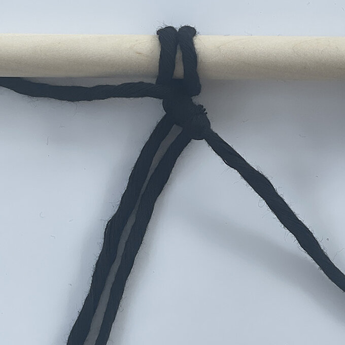 Take 2 x 3m cords and tie them on the dowel with the Reversed Lark’s Head Knot.
