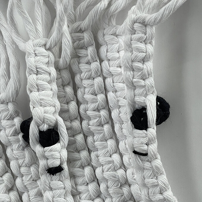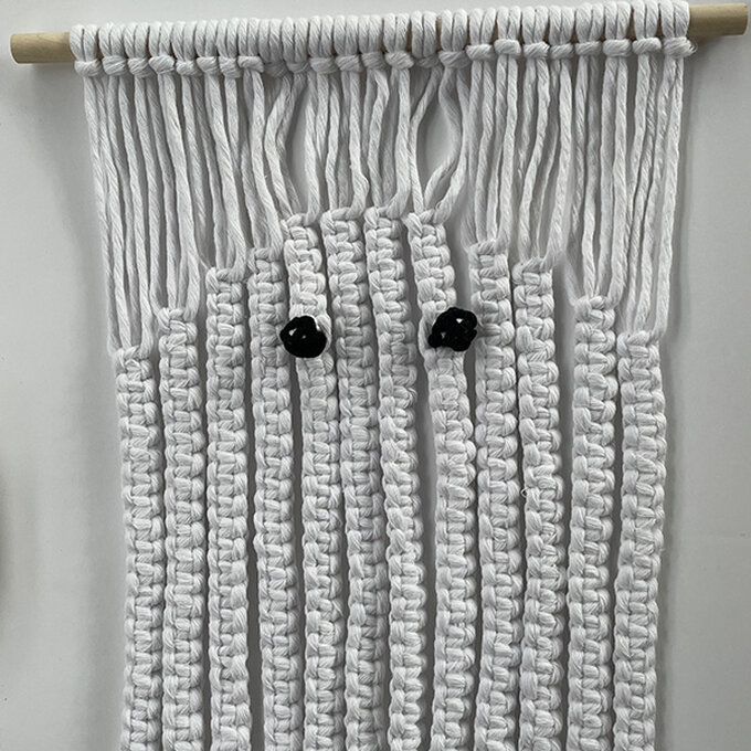 Using the white strings, tie two rows of Square Knots, skipping the rows with the black Berry Knots.