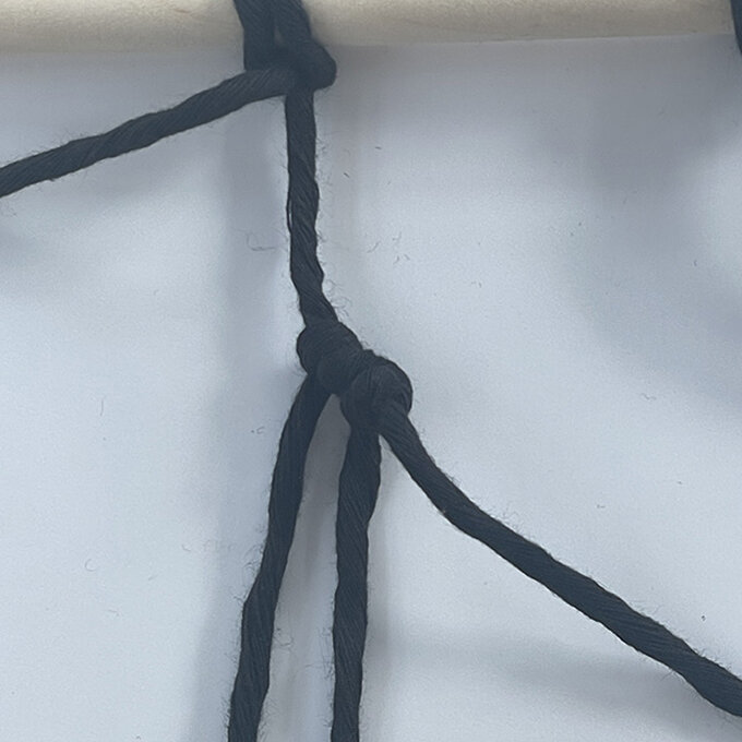 Take the last 3m string, tie a Reversed Lark’s Head Knot over the knot and add a half hitch on each side.