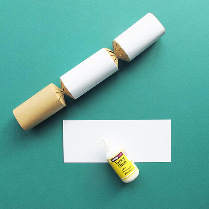 Measure and cut 3 pieces of white paper to cover the barrel and ends of the cracker. Then wrap and stick each piece around the cracker with glue or double sided tape.