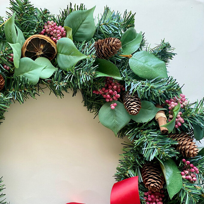 Create a welcoming artificial Christmas wreath for your door with a mixture of faux and natural materials and these easy step by step instructions.