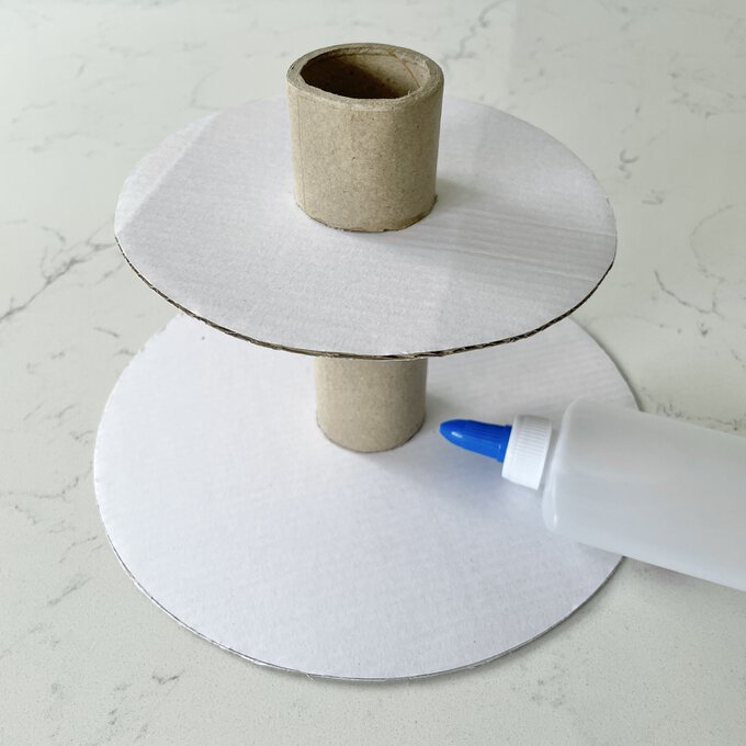 Take the longer tube piece and stick it to the middle of the larger cardboard circle. Then stick the other end of the longer tube to the bottom of the smaller cardboard circle to join the pieces together. Leave to dry.