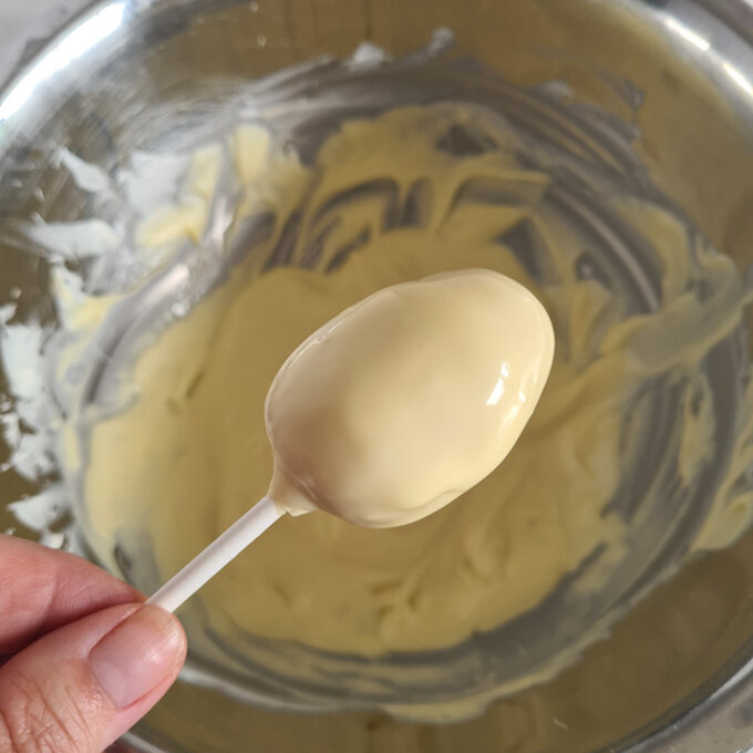 Dip each cake pop in your choice of coloured Deco Melts, ensuring the cake pop is completely covered. Lightly tap the stick gently and repeatedly on the side of the bowl a few times to knock of excess Deco Melts and ensure a smooth finish.