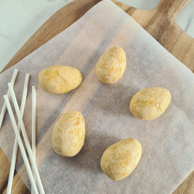 Dip the end of a lollipop stick into the Deco Melts and then insert it into the wide end of the egg. Stand each egg cake pop upright in a block of polystyrene (or stand them up in cups of rice) to set.