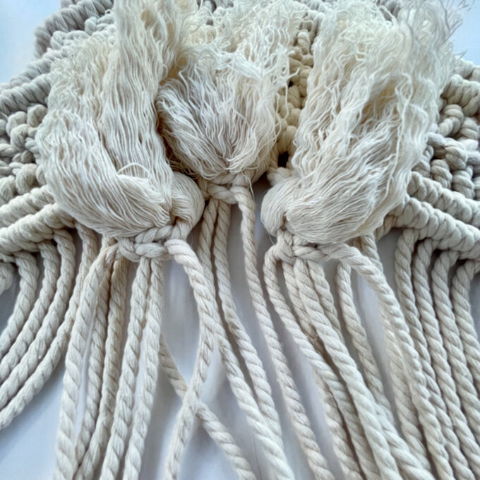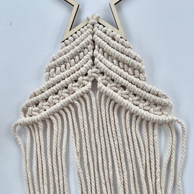 Turn your macrame and using the two strings in the middle as two guides, tie two lines of Double Half Hitches going in the opposite direction.