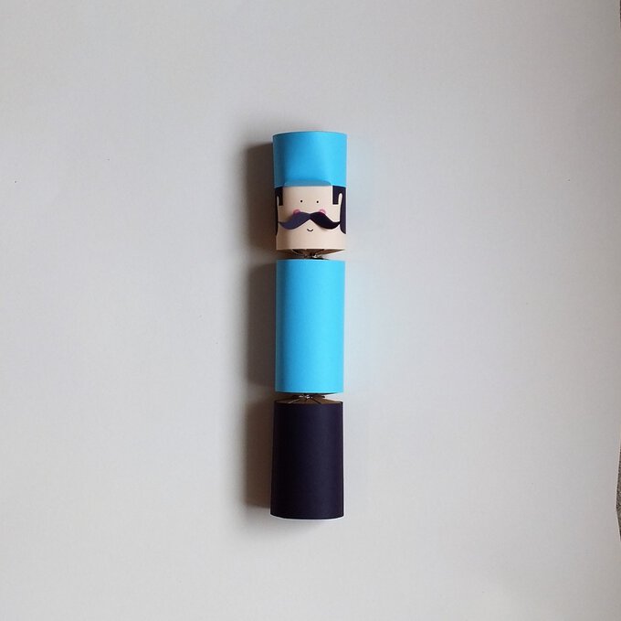 Wrap an 8.5 × 17.5cm panel of black cardstock around one end securing in place using tacky glue. Trim a 9.8 × 17.5cm panel of blue cardstock for the cracker middle, followed by a 5.5 × 17.5cm peach cardstock for the other end securing both in place using more glue.