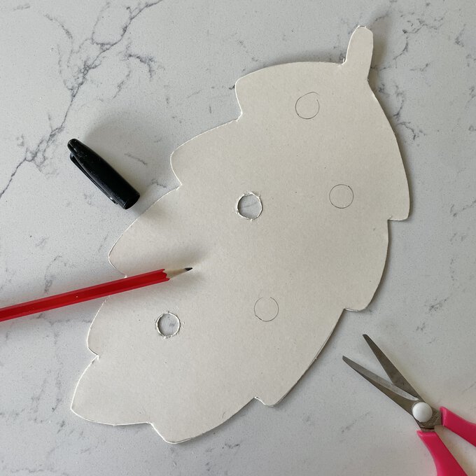Use a pen lid or similar to draw some 1cm diameter circles on the leaf, and carefully cut out. (You may need an adult to help with this.)