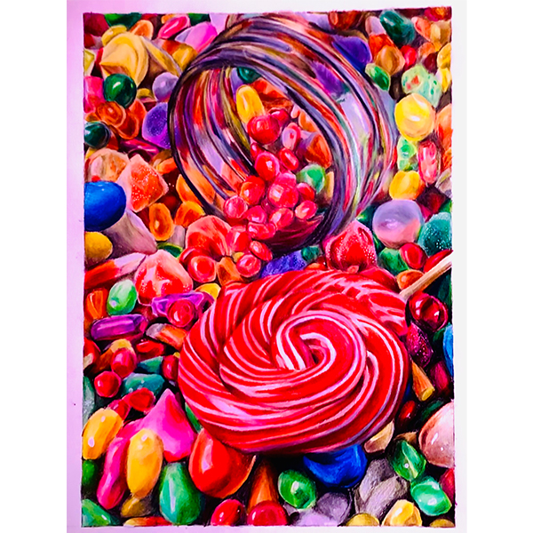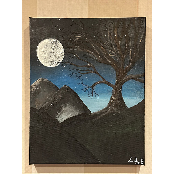 “Lilly’s masterful painting expresses feeling through the composition and contrast. I really loved hearing that Lilly’s imagination took over once the painting was underway and the expressive brushwork on the tree branches light up by the moonlight is really effective. The smooth gradient of the sky contrasted with the texture of the full moon is brilliant. Lilly has created a piece here that is both comforting and lonely, peaceful and ominous; The more you look the more you feel about it, and that is exactly what a great painting should do. Congratulations Lilly, keep painting and listening to your imagination!” - Junior category judge, Artist Abby Hobbs